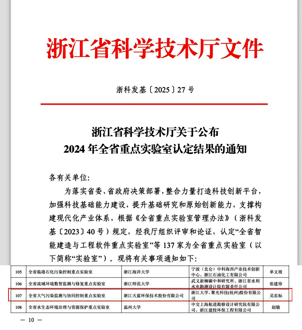 2025年6月4日,浙江省科技廳發(fā)布《浙江省科學技術廳關于公布2024 年全省重點實驗室認定結果的通知(浙科發(fā)基〔2025〕27號)》,由浙江天藍環(huán)保技術股份有限公司牽頭,浙江大學和聚光科技(杭州)股份有限公司共建的“全省大氣污染監(jiān)測與協(xié)同控制重點實驗室”獲批組建,成為全省環(huán)境領域唯一以企業(yè)牽頭建設的省級重點實驗室。